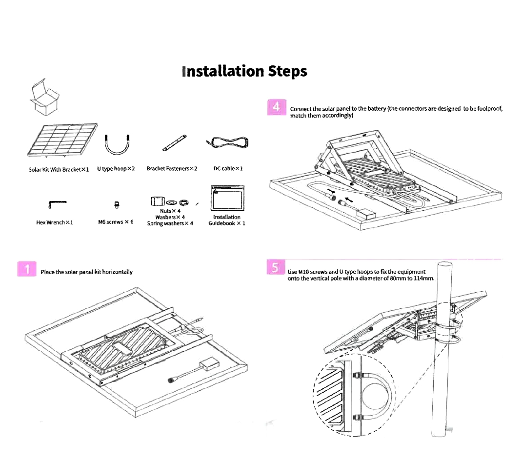 + Das System kommt mit einem U-förmigem Montagebügel anwendbar auf Masten mit einem Durchmesser von 80-114mm der auch für die Säulenmontage verwendet werden kann.