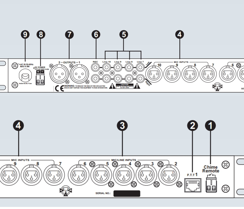 Eingänge: 7-10 Symmetrische XLR-Eingangs-Buchsen für Mic-Signal