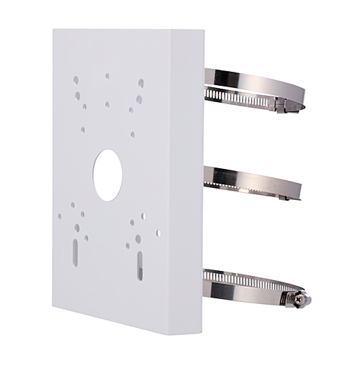 Masthalter zur Befestigung von Outdoor Produkten wie Kameras, Dome, Audiotechnik, Beleuchtungen usw. für Masten mit 80 - 150mm Durchmesser.  Universal Masthalter für Wandarme, Kameradoms, Lautsprecher, Beleuchtungstechnik usw  Masthalterung zur Befestigung von Kameras Leuchtmitteln Lautsprechern usw. Universell verwendbar Halterung für Masten, Pfosten, Regenrohre usw. Die Kamera oder auch Lautsprecher wird auf der ALU Druckguss Basisplatte befestigt; Anbringung an Masten bzw. Rohre mit Hilfe von 3 hoch widerstandsfähigen Befestigungschellen (Metallbänder) für einen Mast-Durchmesserbereich zwischen 80 und 150 mm. Universell verwendbar. Kann auf allen zylinderförmigen Oberflächen angebracht werden, deren Abmessungen in diesem Bereich liegen.  TECHNISCHE DATEN  Für Rohre im Durchmesserbereich 80... 150 mm Abmessungen H: 170mm B: 130mm ( H: 42mm )  Mitteloch auf Basisplatte = 35mm Durchmesser  Umgebung Innen/Außen Material Aluminium Druckguss Platte 3,3mm Materialstärke 4 x integriertes Gewinde M8  8 x integriertes Gewinde M6 3x integriertes Gewinde M4 9x integriertes Gewinde M3 Farbe Weiß Belastbarkeit laut Herstellerangaben bis max 22Kg  PACKUNGSINHALT 1x Halterung weiss ALU Druckguss  4x V2A M8 Schrauben für die Montage  2x Stahlbänder (B: 14mm) für Mast von 80mm bis 150mm Umfang  1x Inbusschlüssel
