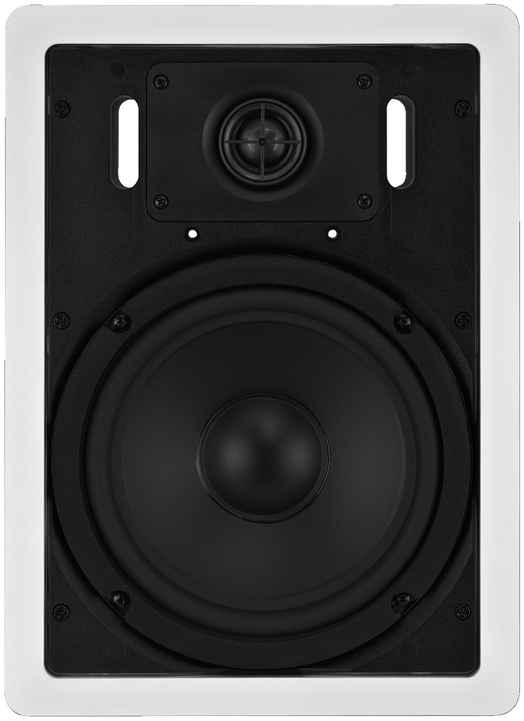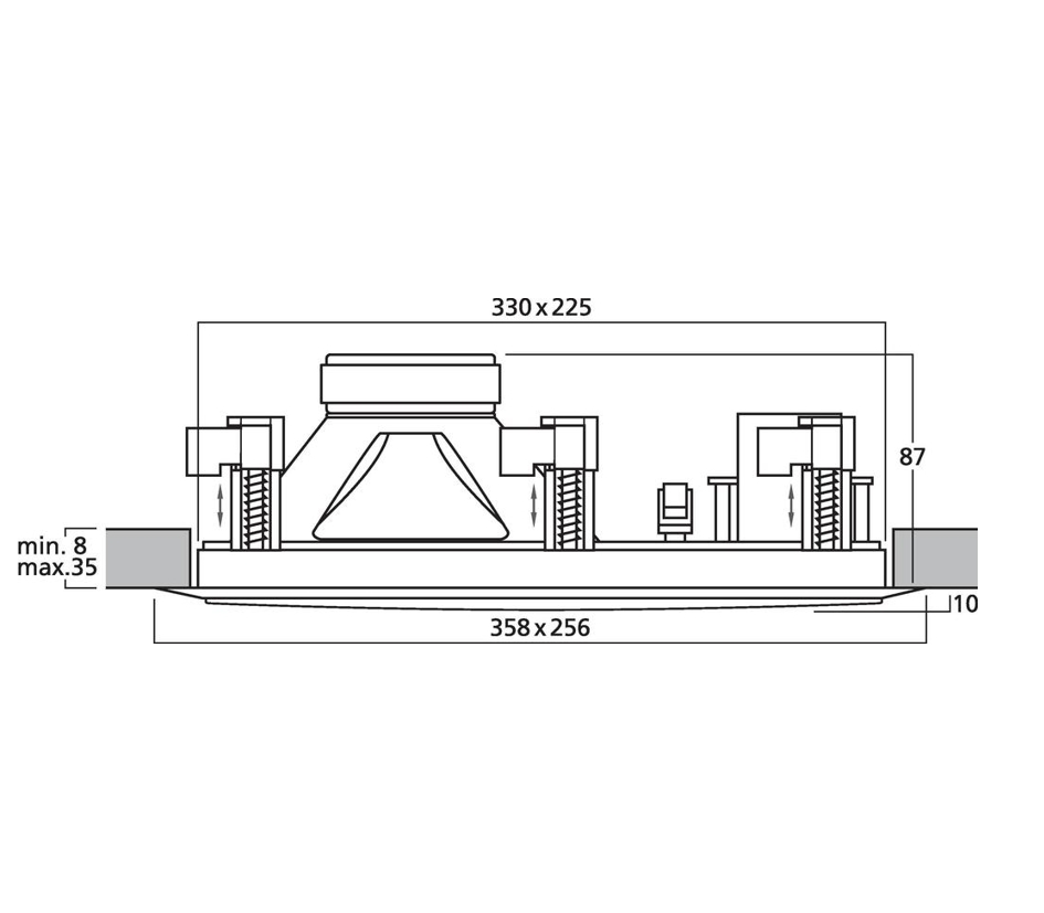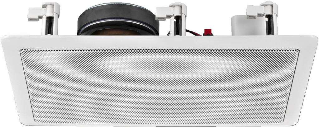 HiFi Deckenlautsprecher 2-Wege System mit Bass und integriertem Kalotten-Hochtöner. Einbaulautsprecher in einer rechteckige Einbauvariante in guter Ausführung. Rückseitig integrierte Frequenzweiche mit 165mm Bass und Kalottenhochtöner / Weisser Kunststoffträger mit 6x schraubbarem Schnellspannverschluß (Zugklammern) für Deckenstärken bis 35mm. Herausnehmbare weiße Frontblende aus Lochblech.