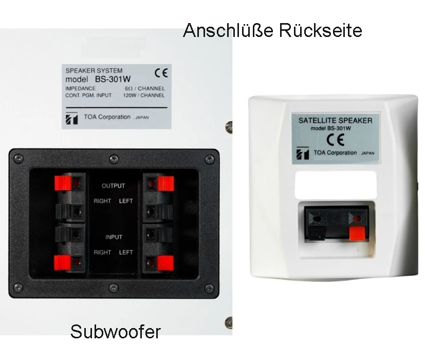 SET mit 4x Satellitenlautsprecher mit Subwoofer 2x160W 4-Ohm Ideal für Caffee Kneipe Restaurant Gastro Geschäfte Fachmarkt BoutiqueSet aus vier Satelliten-Lautsprechern und einem Subwoofer, alle mit einzelnen Halterungen. Kompakt in den Abmessungen und hocheffizientes System + Der Subwoofer kann einfach auch versteckt werden z.B. unter Sitzecken ... hinter Schränken Vorhängen usw.Tolles klanglich hervorragendes Satelliten-Lautsprechsystem mit Subwoofer der versteckt angebracht werden kann. Das kompakte 4er Satelliten-Lautsprechersystem kann effektive akustische Klänge in kommerziellen Räumlichkeiten wie Restaurants, Cafés, Bistro und Einzelhandelsgeschäften erzeugen. Satelliten-Lautsprecheranlage mit 1x Subwoofer und 4x Satelliten-Lautsprechern, ABS-Frontplatte, Holzgehäuse (Subwoofer) oder HIPS (Satelliten) Es gibt 4 kleine Satellitenlautsprecher, die dem Design der kommerziellen Räumen entsprechen und mithilfe von Metallwinkeln installiert werden können, um auch in komplexen Räumen geeignete angepasste Klänge zu erzeugen. Siehe auch weitere Bilder ! Der beiliegende Subwoofer im Set, die temporär oder fest installiert werden können, runden das Klangbild ab. Technische Daten : Leistung 2x 160W ( 2x 80W rms Leistung ) Impedanz 4-Ohm ( Betrieb über normalen 4-8-Ohm Verstärker ) Audiofrequenzbereich : 40Hz ... 20.000 Hz ( guter HiFi Sound ) Lautsprechersysteme : Stereo-Subwoofer mit 16cm System = 2 Kanäle Abmessungen des Subwoofers: B: 210mm 390mm x T: 563mm Satelliten-Lautsprecher: 80mm HiFi-Lautsprecher Abmessungen : B: 92mm H: 97.5mm T: 100mm Ausführung : HIPS lackiert Farbe: reinweiß ( RAL9010 oder ähnlich ) Gewicht: 13,9Kg Subwoofer + 4x 0,6Kg = Satelliten = 2,4Kg = Gesamt 16,3Kg Auch in Schwarz erhältlich = Art-Nr 88-500-06302 ( Nr unter Suche oder unter Rubrik "Ähnliche Artikel " )