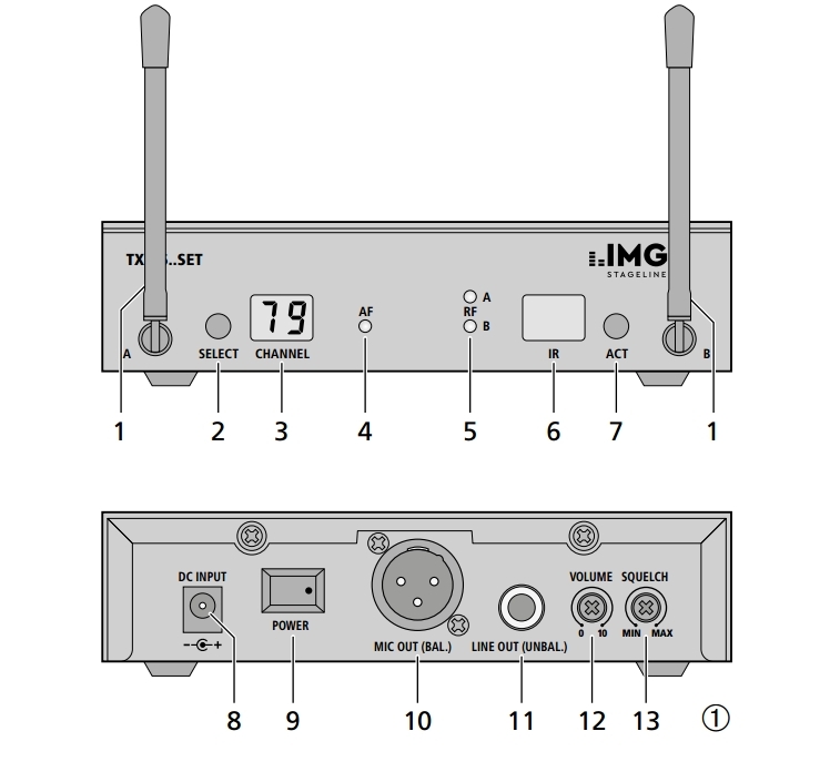 - Anzeige für Kanal, Antenne A/B, ACT-Status und NF-Audio-Level (Empfänger), Kanal und Batteriezustand (Handmikrofon)
