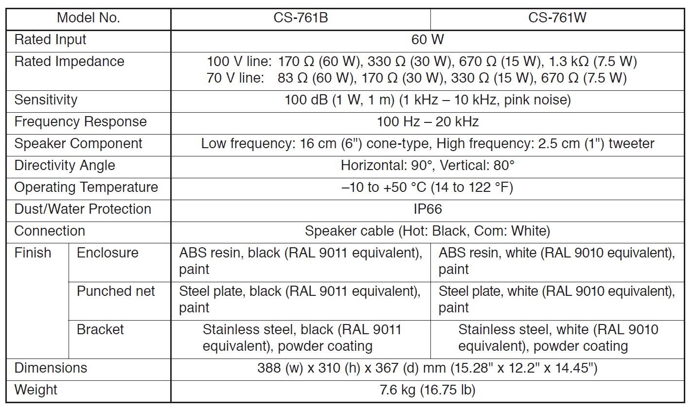 - Bei Betrieb über 100V Verstärker : 170-ohm ( 60W ), 330-Ohm ( 30W ), 670-Ohm ( 15W ), 1,3-Kohm ( 7.5W )