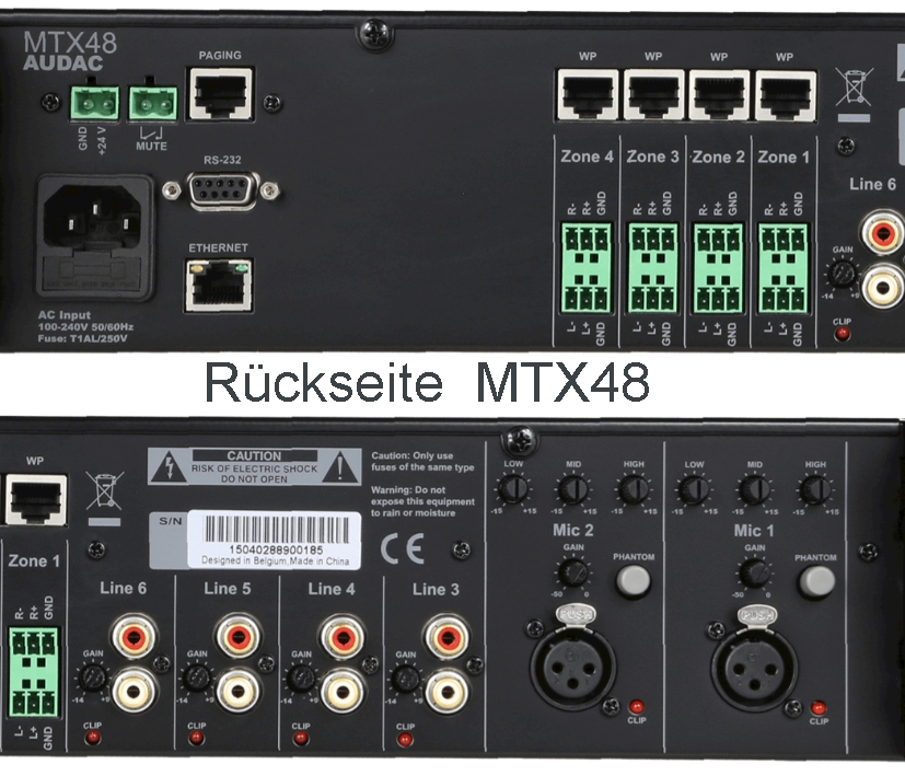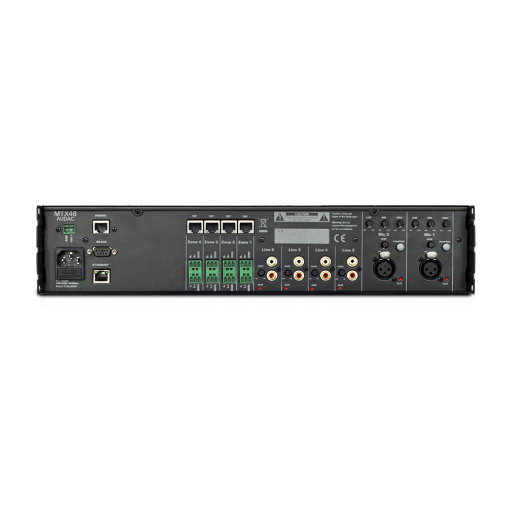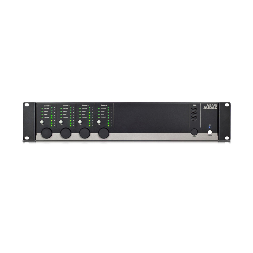 Audac MPX 48 - 4-Zonen Multizonen Audio Matri mit 4x NF-Audio Eingängen und 4x NF-Audio Ausgängen sonwie + 1x RJ45Buchse für den LAN Anschluß an ihr Netzwerk zum bedienen per APP = MTX Remote oder AUDAC Touch App und eine weitere RJ45Buchse für optionale LCD-Wandpanels ( MWX65 ) zum bedienen fals benötigt.