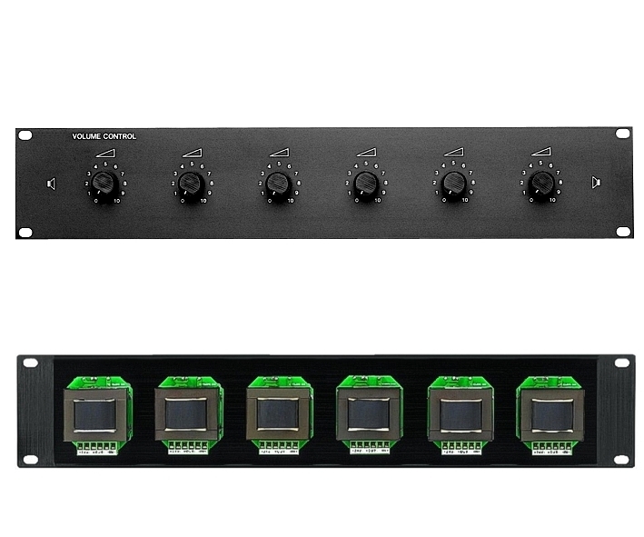 6-fach ELA Lautstärkeregler bzw. Steller für den 19zoll Rackeinbau oder auch den Unterbau in Schränken etc. 100V Lautstärkeregler 6-fach Unit 19zoll 2HE 6x60Watt rms Lautstärkeregler Einbaueinheit für 19zoll Rackmontage 6-fach 6x90Watt Musikleistung Peak. Wie es Ihnen gefällt!. Egal ob in einem Büro, Arztpraxis, Fachmarkt, am Flughafen, in einem Museum oder in der Schule, sie sind überall zu finden. Lautsprecheranlagen die mit 100V-Technik betrieben werden. Genutzt werden diese sowohl für Durchsagen als auch zur Hintergrundbeschallung. Doch was machen Sie, wenn gewisse Durchsagen nur für bestimmte Räume, Abschnitte oder Abteilungen gedacht sind? Oder wenn die Hintergrundbeschallung nicht überall gleich laut sein soll? Genau an dieser Stelle dürfen wir Ihnen unseren Zonenregler vorstellen, der das Eingangssignal auf bis zu 6 Zonen aufteilen und jeden Kanal individuell einstellen kan 6x Audio-Transformatoren für 100V oder auch 70V Übertragungstechnik Anschluss für Vorrangschaltung Abschwächung in 11 Stufen (0dB bis -33dB, Stufe 0 ist AUS) 19zoll Frontplatte ohne rückseitiges Gehäuse Schraub-Steck-Anschluss Technische Daten: Frequenzbereich 25...20.000Hz Nennbelastbarkeit je Kanal 60W RMS bzw. 6x90Watt Musikleistung Pflichtempfang: Ja 6 Pflichtempfangsrelais (24V Gleichstrom 12mA) Die Pflichtempfangsrelais dient nur dazu den Regler zu umgehen egal wie dieser gerade eingestellt ist auf volle Lautstärke Nur wenn Sie die Pflichtempfangsfunktion überhaupt benötigen muss die verdrahtet sein Beim normalen Betrieb ( nur Reglerfunktion ) ist das Pflichtempfangsrelais nicht zu beschalten 19" Einbaumaße mit 2 Höheneinheiten (H: 88mm) Abmesungen: 483 x 88 x 77 mm Gewicht 2,4kg Fragen zum Produkt ? Einfach anrufen unter 07362-919093