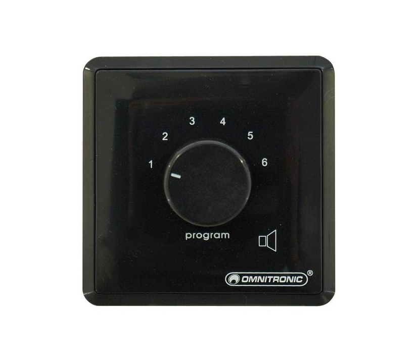 Musik Programmwähler für bis zu 6 verschiedene Tonquellen, schaltet eine von 6 Signalquellen auf einen Lautsprecherausgang Geeignet für 100V ELA Audiotechnik Eingebautes Relais (24V) für Vorrangschaltung Frontplatte und Knopf aus schwarzem Kunststoff Unterputzmontage in gängigen 60er-Schalterdosen Aufputz-Montage mit passendem, optional erhältlichem Gehäuse (siehe Zubehör-Register) Einbautiefe 35mm Schraubkontakte Pflichtempfangsrelais: 24V 8mA (nur zu beschalten falls nötig) Einsatztemperatur: . . . . . . . . 0 – 40 °C Abmessungen 80 × 80 × 57mm (mit Knopf) Einbautiefe: 35mm Gewicht: 110g Auch in silber erhältlich
