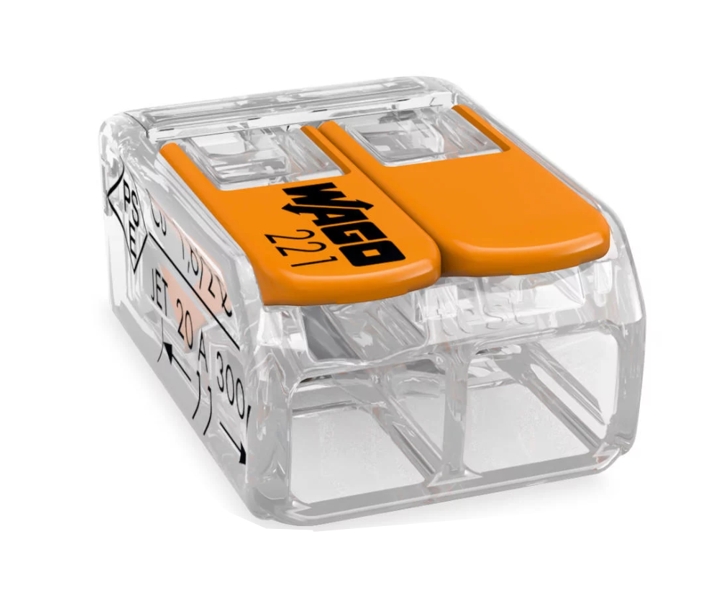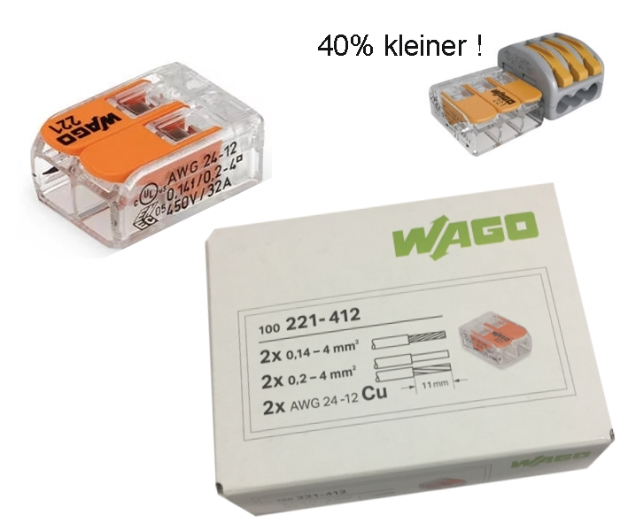 WAGO 2-Leiter Klemme . Die einfachste Art zum Verbinden und Lösen von Drähten und Litzen Einfach den orangefarbenen Betätigungshebel so weit öffnen bis er einrastet, Leiter einführen und Hebel wieder in Ausgangsposition (bündig mit dem Klemmengehäuse) umlegen. Verbindungsklemme wieder lösbar 2-Leiter Klemme Gesamte Anzahl der Potenziale 1 Steck-Klemmanschluss für feste und flexible Leiter Ø 0,08-4qmm Für Kabelquerschnitt: Feindrähtig oder eindrahtrig 0,08...4qmm Belastbarkeit 450V Nennstrom bis 32A Technische Daten: Die einfachste Art zum Verbinden und Lösen von Drähten und Litzen. Einfach den orangefarbenen Betätigungshebel so weit öffnen bis er einrastet, Leiter einführen und Hebel wieder in Ausgangsposition (bündig mit dem Klemmengehäuse) umlegen. Verbindungsklemme wieder lösbar / 2Leiter Klemme Gesamte Anzahl der Potenziale 1 Steck-Klemmanschluss für feste und flexible Leiter Ø 0,02...4qmm Für Kabelquerschnitt: Feindrähtig 0,08...4qmm, und eindrahtig bis 4qmm Betätigungsart Hebel Anschließbare Leiterwerkstoffe Kupfer Nennquerschnitt 4 mm² Eindrähtiger Leiter 0,2 … 4 mm² / 24 … 12 AWG Mehrdrähtiger Leiter 0,2 … 4 mm² / 24 … 12 AWG Feindrähtiger Leiter 0,14 … 4 mm² / 24 … 12 AWG Abisolierlänge 11 mm / 0.43 inch Belastbarkeit 450V Bemessungsstoßspannung (II / 2) 4kV Nennstrom bis 32A Farbe transparent Brennbarkeitsklasse gemäß UL 94 V2 Dauergebrauchstemperatur bis 105 °C T-Kennzeichnung gemäß EN 60998 T85 Abm.: B: 13,1mm x H: 8,3mm x T: 18,6mm